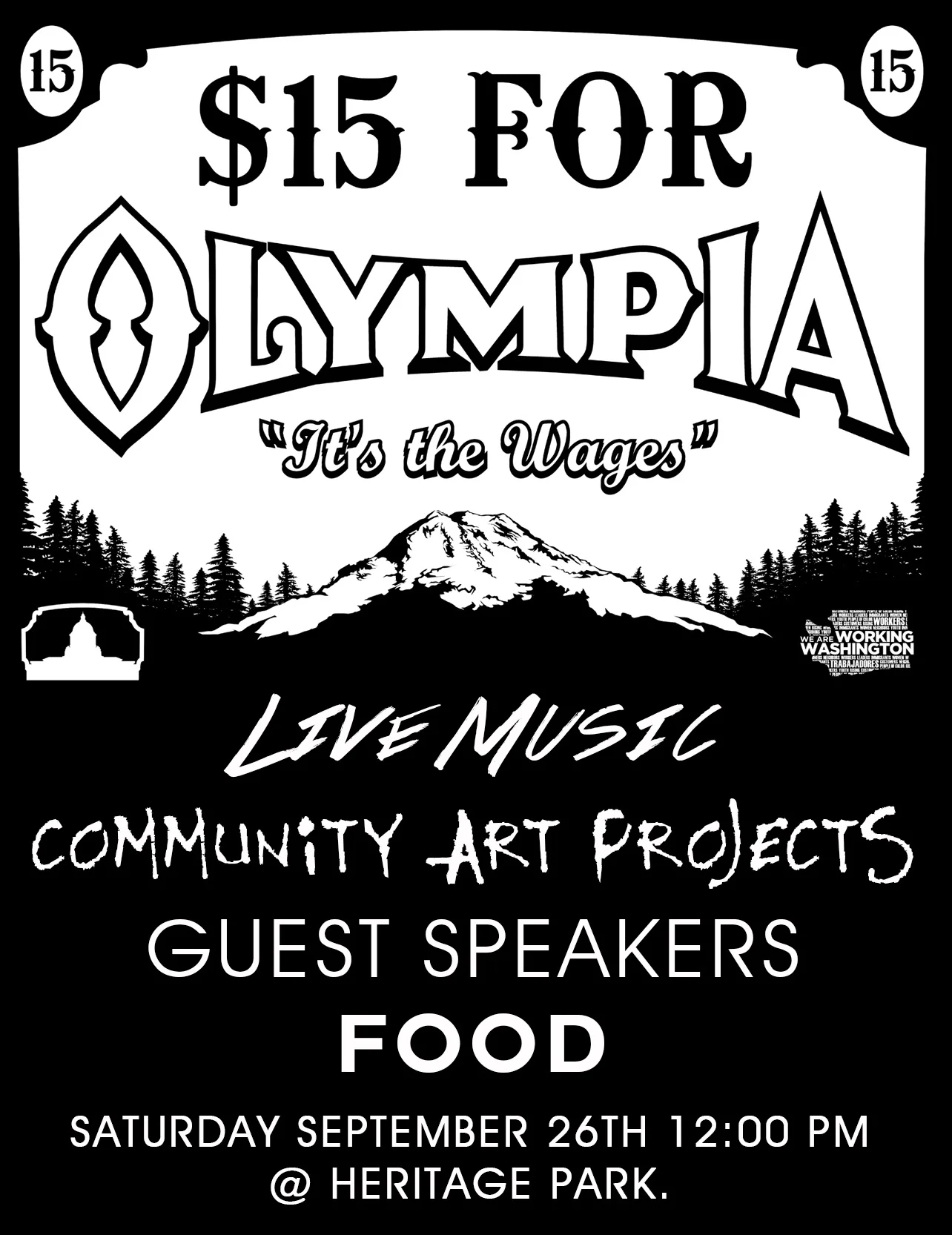 On September 26th at Heritage Park in Olympia, join us as workers and community members have a community day in support of $15 for Olympia. Food, live music, art projects, guest speakers, and more are all happening.