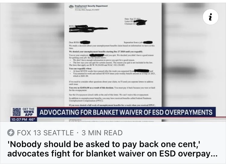 So workers are speaking out to demand the state waive these threatening “overpayment notices”. And FOX 13 News in Seattle took up the story: